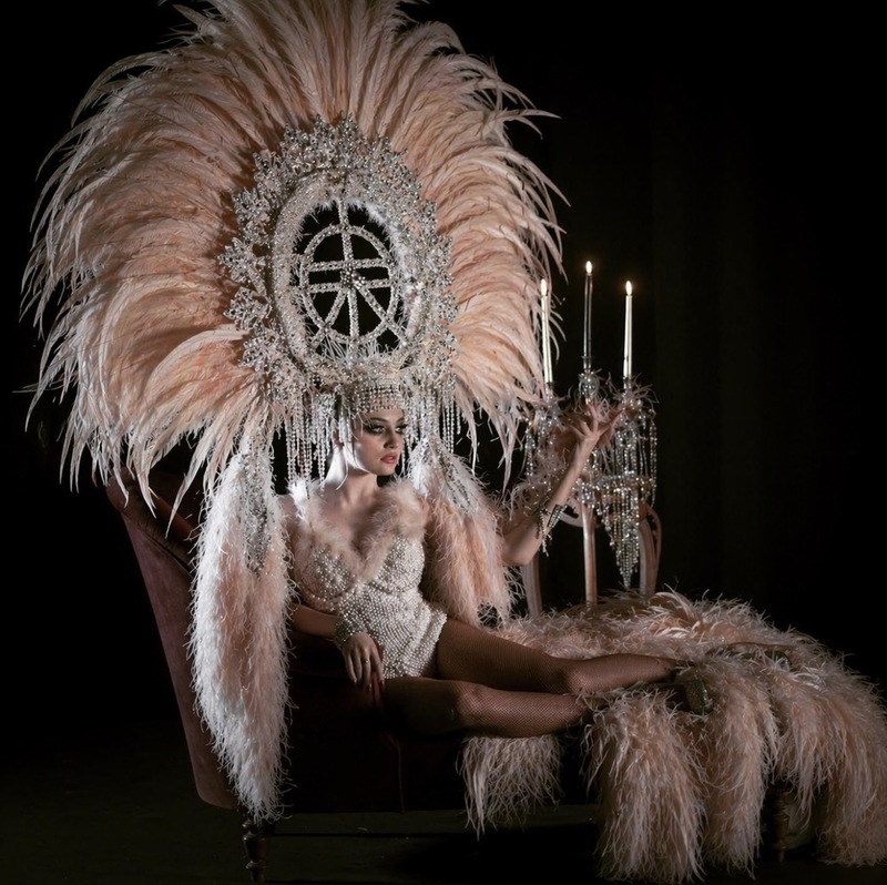 Disponible dans divers Coloris Ce casque composé de Plumes de coq, de Plumes d’autruche et de boa d’autruche 8 plis
